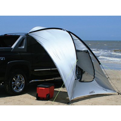 This new innovative SUV and Truck Shade Tent attaches directly to the roof rack of any SUV or Truck. It is designed with a silver taffeta material to reflect the suns rays for increased UV protection and extra cooling comfort. This truck shade is equipped with a large mesh window which can be zippered closed in the event of a storm or extreme heat. This tent is has an upgraded pin and ring frame system with shock corded fiberglass poles for quick setup and breakdown. Its universal design allows it to attach to any SUV or Truck or anything else that has a luggage roof rack and it comes complete with a carry bag and ground anchors.